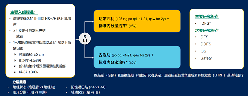 达尔西利(Dalpiciclib)是AG真人平台医药自主研发的口服、选择性的小分子CDK4/6抑制剂,也是中国首个自主研发的新型高选择性 CDK4/6 抑制剂,已证实其与内分泌治疗(ET)联合用于 HR+/HER2- 晚期乳腺癌的一线和后线治疗时,均显著改善无进展生存期(PFS)6,7。因此开展了一项随机、双盲、III期临床试验(DAWNA-A),以进一步评估达尔西利联合内分泌治疗作为高危早期 HR+/HER2 - 乳腺癌辅助治疗的效果。本研究纳入高危复发风险人群需满足以下标准之一:①≥4 枚阳性腋窝淋巴结;②1–3枚阳性腋窝淋巴结且合并≥1 项高危因素(肿瘤直径 ≥5 cm,组织学分级3级,辅助治疗后残留浸润性乳腺癌,Ki-67 ≥30%)。本文呈现预先设定的首次中期分析(IA1)结果。